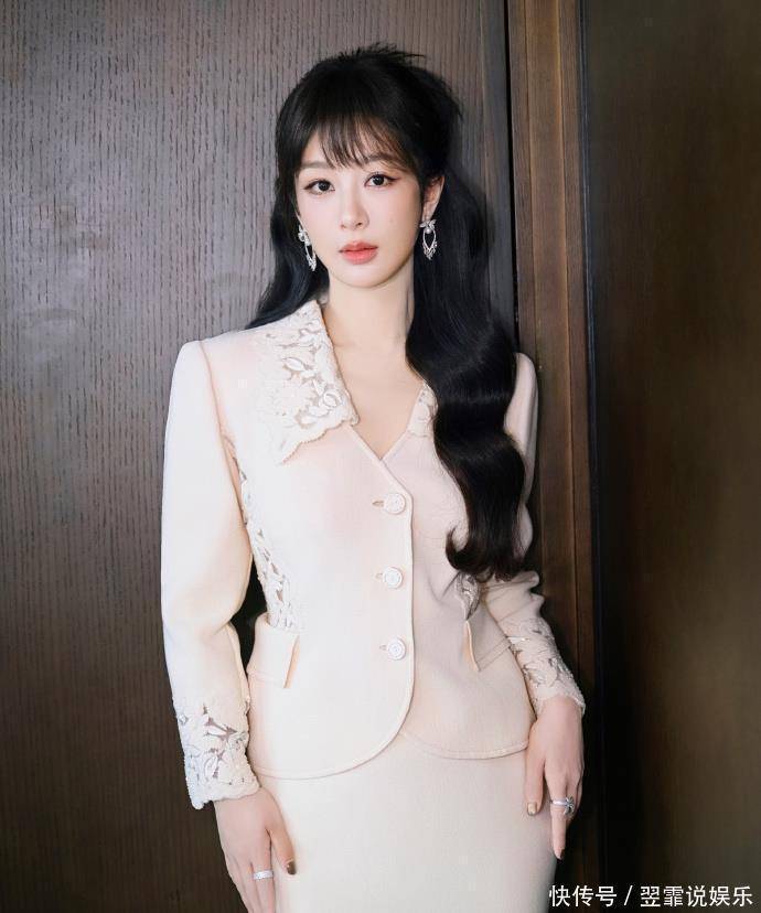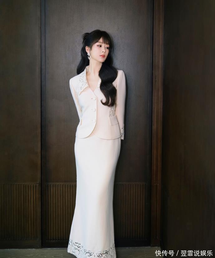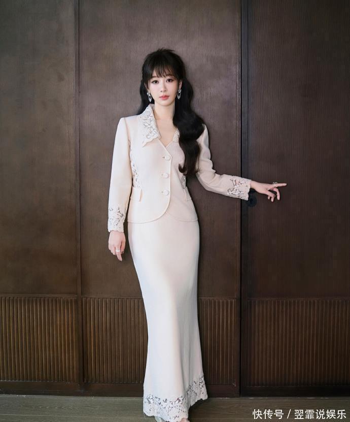 内搭的长裙选择了与西装套装同色系的设计统一性和协调性极佳。裙摆的蕾丝边缘设计与外套相呼应让整体造型看起来更有连贯性和整体感。修身的版型突出杨紫的身材曲线带有女性化的优雅。