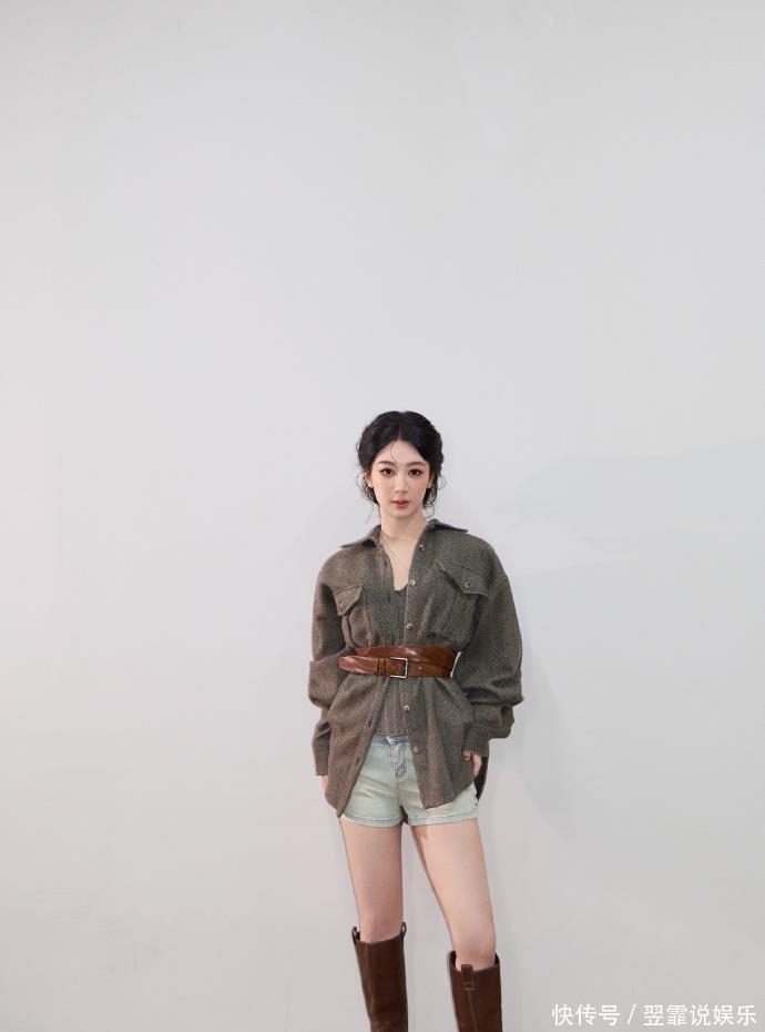 下身搭配的高腰牛仔短裤也是这套造型的时尚利器既能够完美展示腿部线条又能拉高腰线优化身材比例。牛仔材质增添了一丝休闲和俏皮使得整体造型不显得过于严肃。脚上的棕色长靴不仅增加了造型的硬朗感还通过其长度拉长了腿部线条使得整体比例更加协调和修长。