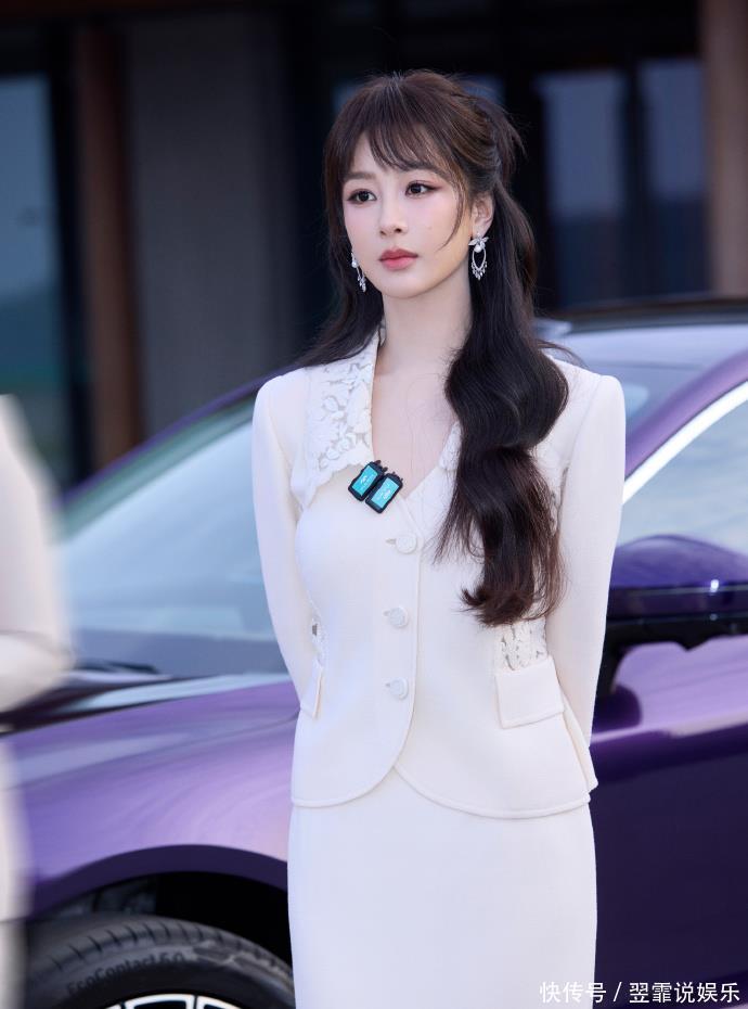 整体穿搭通过白色刺绣蕾丝西装外套和长裙的经典搭配展现了杨紫温婉、优雅且高贵的气质。蕾丝的运用不仅增加了女性化的柔美感还提升了整体的精致度。白色系的选择让整个造型清新脱俗散发着纯洁与高雅的氛围。